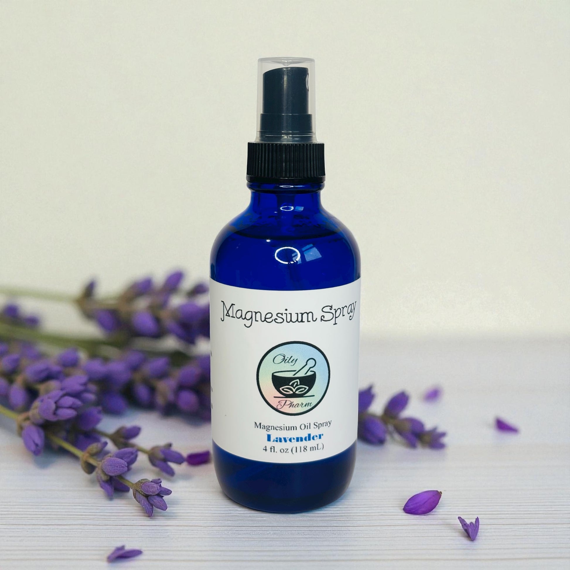 4 OZ LAVENDER MAGNESIUM OIL SPRAY - Made with all natural magnesium chloride for maximum relief. Infused with pure lavender essential oil for a calming and soothing effect.
