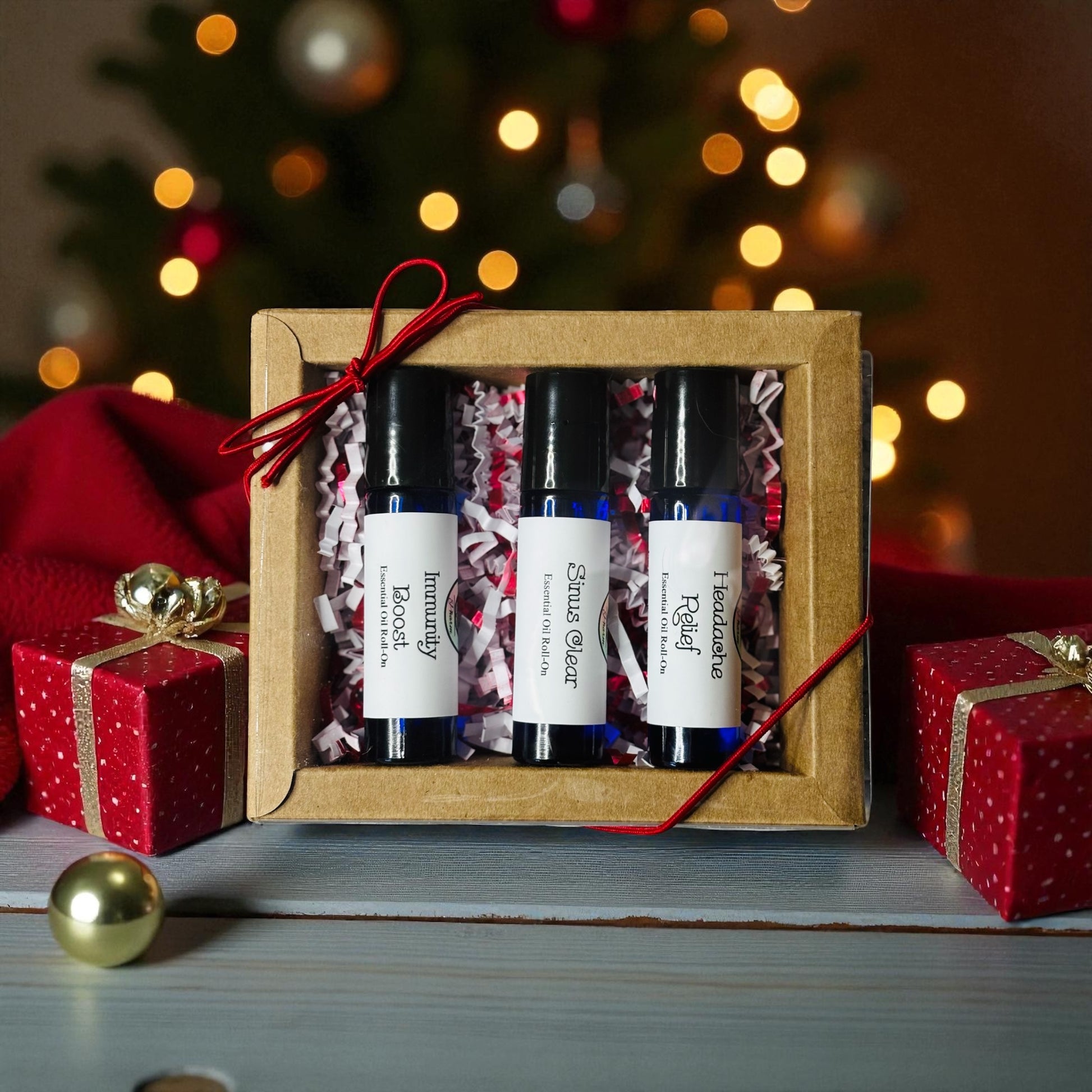 This listing is for three 10 ml Glass Essential Oil Roller Bottle Blends in a Gift Box.